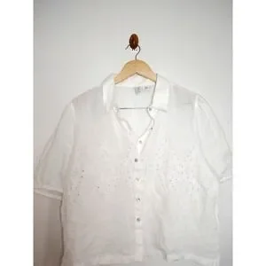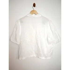 Joie Women XL 100% Linen White Eyelet Short Sleeve Button Crop Shirt Coquette