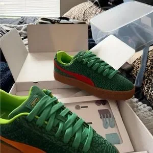 Green kids sneakers with bright lime lining and gum sole. Features turtle-themed details and easy lace-up design. Comfortable padded collar and durable outsole for play. Colorful accents add fun style for everyday wear.