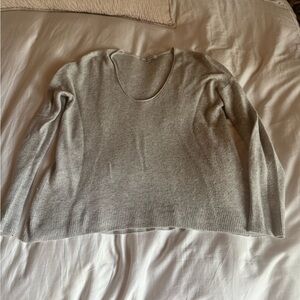 Soft heather gray knit with a classic scoop neckline. Lightweight textured fabric. Versatile neutral layering piece. Shows some signs of wear overall but still looks good, and cute!