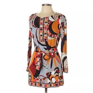 Iconic Emilio Pucci abstract print mini dress. Long sleeves and a crew neckline. Bold graphic pattern in multiple hues. Figure-skimming silhouette. Statement piece for day or night.