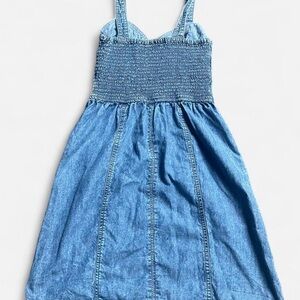 Fitted bodice with button-front detail. Sweetheart neckline and wide straps. Flared A-line skirt with seam accents. Casual denim style for everyday wear.