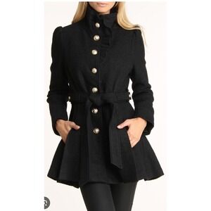 Command attention with this striking Bebe wool blend coat. Its dramatic ruffled collar and elegantly cinched waist create a sophisticated silhouette, while the gold-toned buttons add a touch of regal flair. The puffed sleeves lend a romantic, vintage-inspired charm, and the flared peplum hem ensures a flattering and feminine line. This coat is perfect for making a memorable entrance at a holiday party, a sophisticated dinner engagement, or a chic daytime outing.