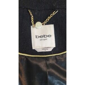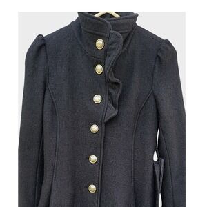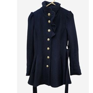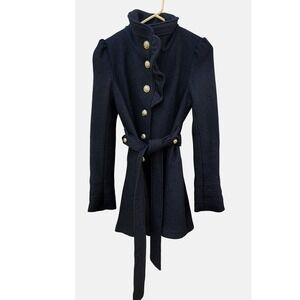 Keywords: Bebe coat, wool blend, ruffle collar, belted coat, peplum jacket, gold buttons, puffed sleeves, feminine, elegant, designer, winter fashion, evening wear, statement coat