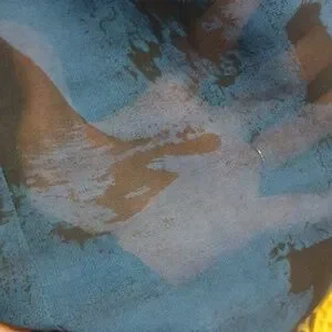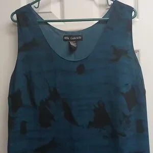Sleeveless maxi with a relaxed fit. V-neckline and side pockets. Teal body with black tie-dye accents. Decorative mustard and patterned border hem. Easy, breezy boho style. top layer sheer...lined in teal side slits, sleeveless with scoop neckline