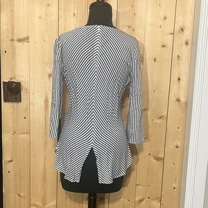 Lightweight tunic with vertical and diagonal stripes. Rounded hem with slight side slit. Crew neckline and 3/4 length sleeves. Easy, polished layering piece.