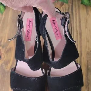 Betsey Johnson. Ajaya. Stylish Black and Multicolor Wedge Sandals. Size 9.