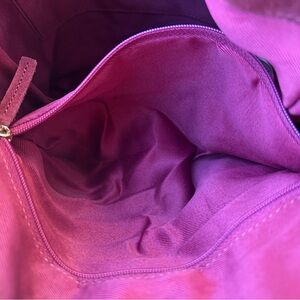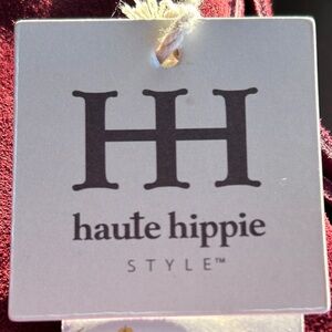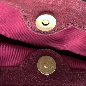 This NWT Haute Hippie Soft suede fringe bucket bag in burgundy or deep wine color has a gold tone buckle attached to the single shoulder strap making the strap adjustable. There is fringe detail running along both sides of this slouchy bag giving it a casual, fun silhouette that’s perfect for every day wear and also fantastic for concerts and festivals.