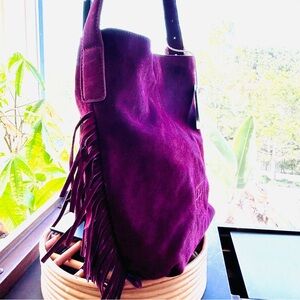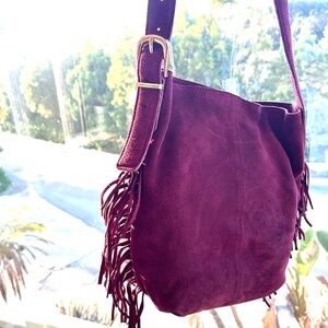 Haute Hippie Fringe Suede Bucket Bag Burgundy / Wine Boho Slouchy design ⭐️NWT⭐️