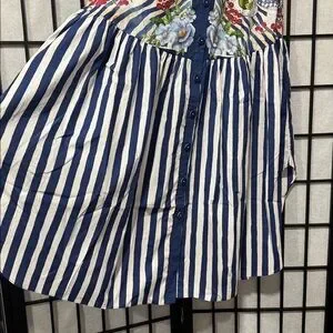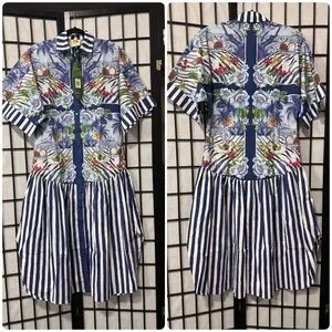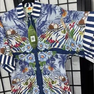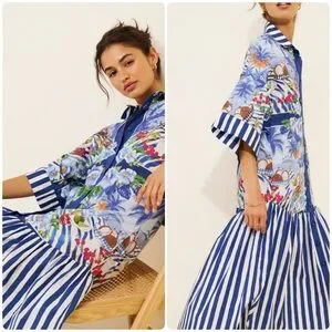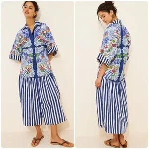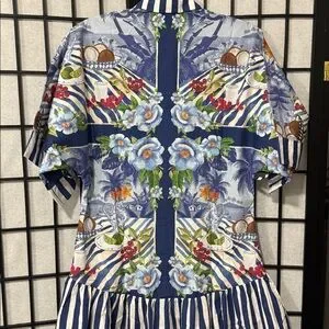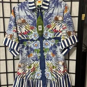 New with tags. Stunning mixed-print midi shirt dress featuring a vibrant tropical scarf-inspired design with blue-and-white striped accents. Designed in a relaxed drop-waist silhouette with a button-front closure and breezy, easy fit—perfect for vacation, brunch, or summer days.