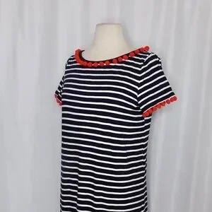 Wide rounded neckline ~ Short sleeves ~ Neckline & ends of the sleeves are trimmed with red pom-poms ~ Straight hemline ~ Shift silhouette ~ Pullover styling … no closures ~ Soft unlined jersey knit fabric ~ Horizontal stripes in navy blue & white … the pompom trims are a bright red