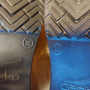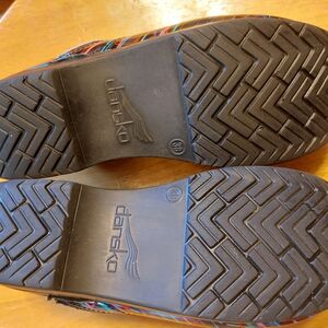 Closed-back slip-on clog with vibrant multicolor scribble pattern. Padded footbed offers support for long wear. Durable, easy-clean upper for daily use. Playful colors brighten any outfit. These have great tread. They have the peeling around the tops of the shoes where your feet slide in. There are some minor scuffs from wearing. Size 38, which I believe is an 8/8.5. Check out my other listings!