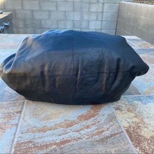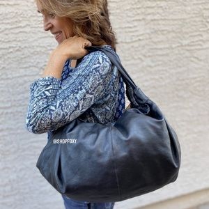 Soft slouchy leather shoulder bag by The Row. Smooth pebble leather exterior. Single wide shoulder strap for comfortable carry. Minimal, unbranded design for versatile styling.