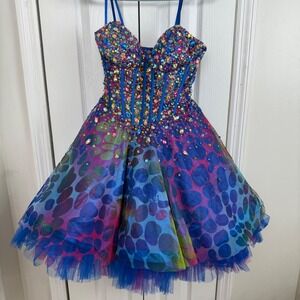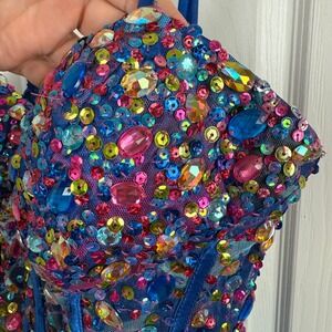 Absolutely stunning Jovani embellished corset dress featuring heavy multicolor rhinestone and sequin beading throughout the structured bodice. Built-in boning creates a flattering silhouette, while the voluminous layered tulle skirt adds dramatic movement and volume.