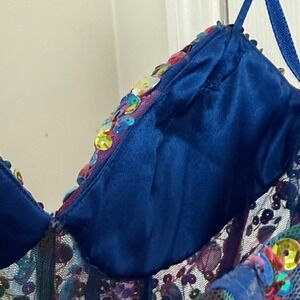 Pre-owned. Overall great condition with minor loose threads typical of heavily beaded garments (see close-ups). There is a faint discoloration on the back under the sheer overlay (see photos). It is subtle due to the layered design and does not affect overall wear.