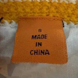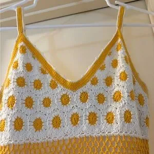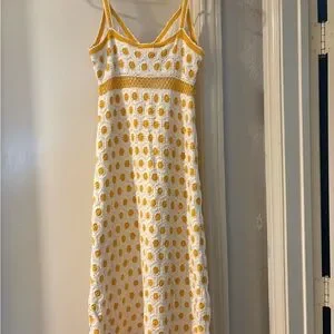 Handmade-look crochet midi dress by Tory Burch. White base with yellow floral dots and trim. V-neckline and slim straps. Feminine and breezy silhouette. Perfect for summer events.