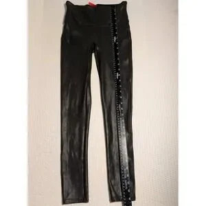 These SPANX faux leather leggings in size S/P are very versatile and perfect for various occasions such as travel, parties, or casual wear. The black leggings feature a solid pattern with a pull-on closure, making them easy to wear. They are made from faux leather fabric and designed with a regular fit, slimming and shaping features, and stretch for comfort. Perfect for women looking for a stylish and trendy piece to add to their wardrobe, these leggings are suitable for those who love a rock, punk, or grunge look.