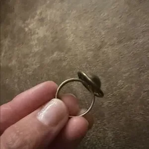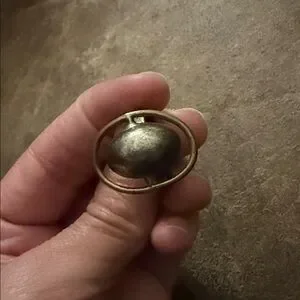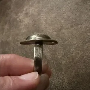 Distinct oval centerpiece with a silver-toned dome. Surrounding gold-toned bezel adds warmth. Simple band enhances wearability. Timeless vintage appeal for versatile styling.