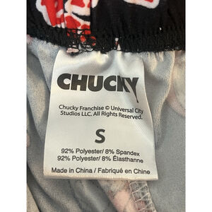 Chucky pajama lounge pants for men in size small. Features a black and red graphic print with Chucky character accents. Made from a soft fleece fabric blend of polyester and spandex. These lightweight lounge pants are perfect for cozy sleepwear.