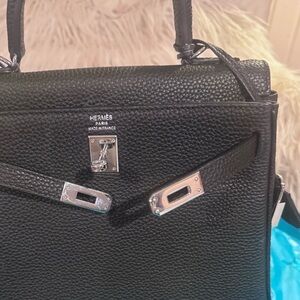 Classic black leather top-handle satchel designed for everyday elegance. Structured silhouette with a secure front turn-lock closure. Comfortable rolled handle and detachable shoulder strap for versatile carry. Timeless black leather complements any outfit.