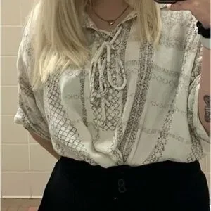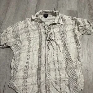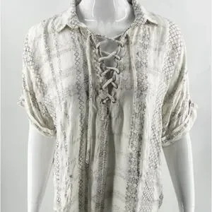Lightweight cream peasant top with subtle beige geometric print. Features a lace-up V-neck and short roll-tab sleeves for a relaxed, boho look. Soft, breathable fabric for everyday comfort. Pair with jeans or skirts for an easy, stylish outfit. Size medium. Bought from buckle