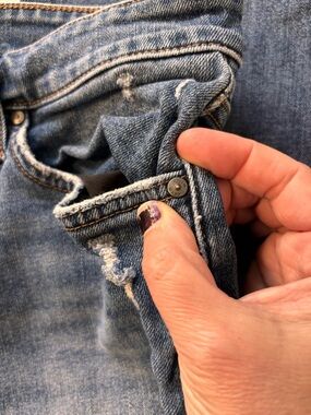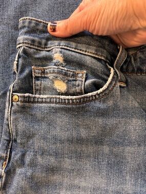 Classic straight leg jeans with distressed details. Perfect for a casual look. Comfortable and stylish. These fit like a size 10/12 and are flattering and comfortable. 79% cotton.