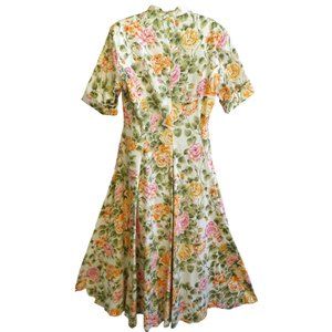Vintage The J. Peterman Company Floral Midi to Maxi Dress. Flattering Princess Seams. Matching Fabric Covered Button Front. Half Sleeves Cuffed. Dry Clean 100% Cotton. Tagged Size 14.