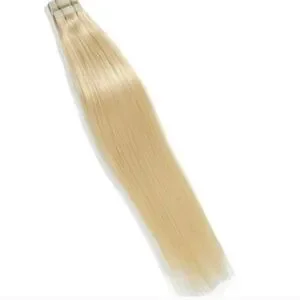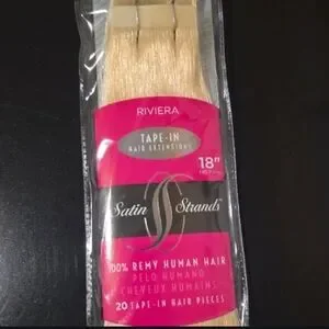 Riviera Satin Strands tape-in hair extensions. 18" length. 100% Remy human hair in a light blonde shade. Smooth, silky texture. Ready for application.
