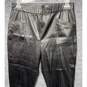 Halston Women's black faux leather pants with a high-waisted design and elastic waistband for comfortable wear. These pants feature stylish patch pockets on the front and a flattering seam detail throughout. Perfect for a night out or a chic daytime look.