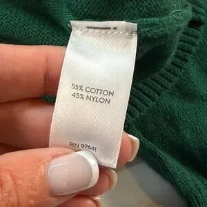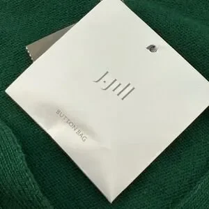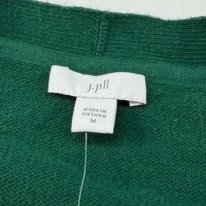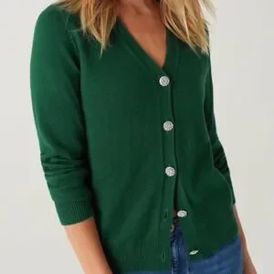 Elegant and cozy, this J.Jill cardigan in rich Boxwood green features sparkling crystal flower buttons that add a touch of festive charm. Made from a soft cotton-nylon knit with ribbed cuffs and hem, it layers beautifully over blouses or tees for an effortless, polished look. From a smoke free home. New with tags.