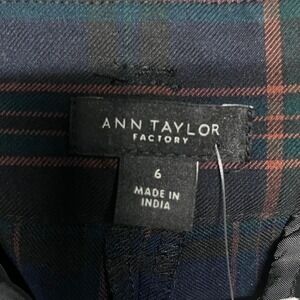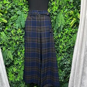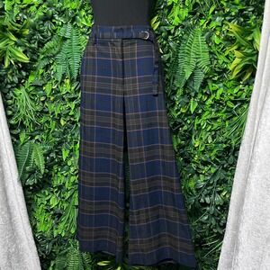 Ann Taylor Factory wide leg pants feature a classic plaid pattern in navy blue, green, and brown tones. These high-rise trousers are designed with a flattering wide-leg silhouette and include a matching fabric belt with a silver-tone D-ring buckle. The woven fabric offers a slight stretch for comfort, while the back features clean welt pockets for a polished look. Perfect for office wear or a sophisticated seasonal ensemble.