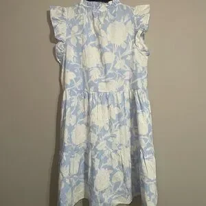 Soft blue dress with white floral print. Ruffle sleeves and tiered skirt add movement. Tie at neckline for easy styling. Lightweight cotton feel for everyday wear.