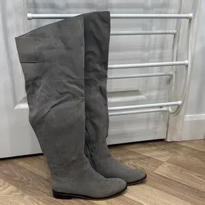 Aldo over-the-knee boots in soft gray suede. Slim, streamlined silhouette with inside zipper. Flat heel for comfortable wear. Clean toe and simple design for versatile styling.