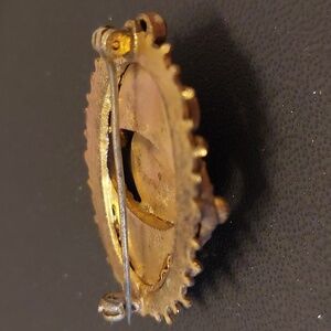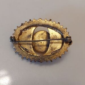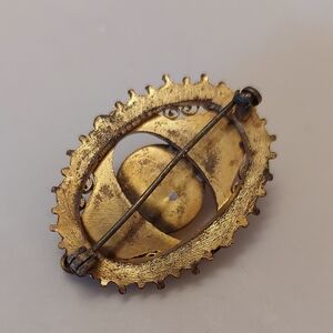 Condition: vintage loss and wear. Older rollover clasp had verdigris- entire brooch gently cleaned in delicate jeweley cleaner and dried. With metal wear/loss, the clasp is NOT fully functional and operates more like the older C-clasp. See photos. This means that to wear this brooch, you would need to repair clasp or trust gravity, like C-clasps operate.