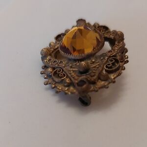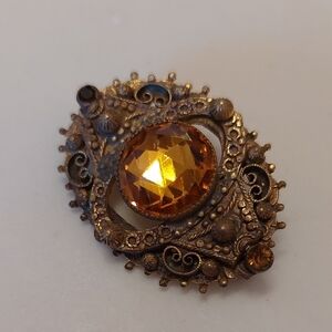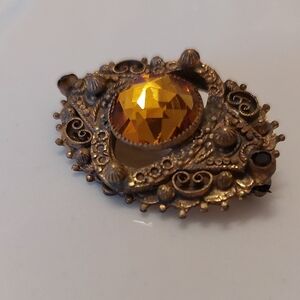 Design Style: Commonly described as Art Deco or Victorian Revival. It features a central large faceted stone—often referred to as topaz glass or honey-colored rhinestone—set in an intricate filigree or scrollwork brass setting.