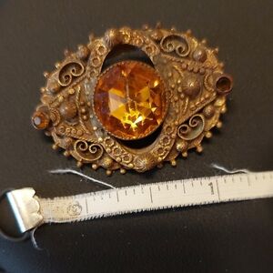 Antique Scrollwork Filigree Topaz Honey Faceted Glass Gold Brooch Pin