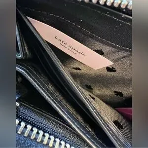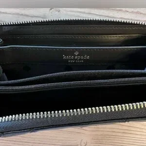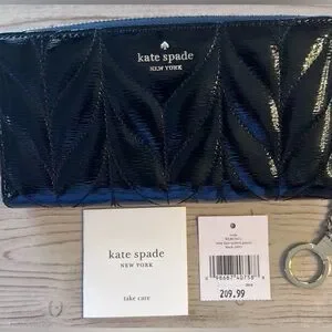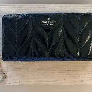 Sleek patent leather wallet by kate spade. Quilted leaf pattern with glossy finish. Gold logo hardware and zipper pull. Compact and stylish for everyday use.