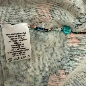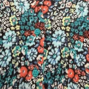 Super sweet cardi with a ditsy multicolored floral print grounded in navy. Extra button still attached.