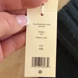 Warm knit wool mittens with signature logo patch. Deep teal color and ribbed cuff. Simple, polished winter accessory.