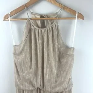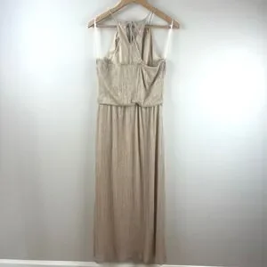 En Focus Studio gold metallic sleeveless maxi dress features a pleated, blouson-style bodice with a high halter-style neckline and a long, flowing skirt. The shimmering textured fabric creates a sophisticated look perfect for formal events, weddings, or evening galas. Designed with a comfortable elasticized waist and a keyhole back closure, this elegant gown offers both style and ease of movement.