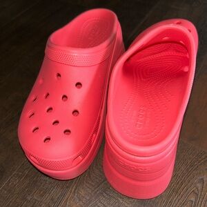 Eye-catching pink platform Crocs. Slip-on design with signature perforated toe. Cushioned footbed for all-day comfort.