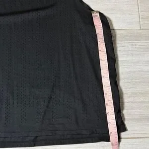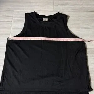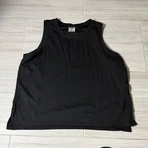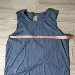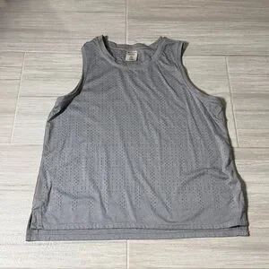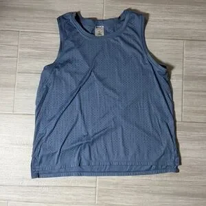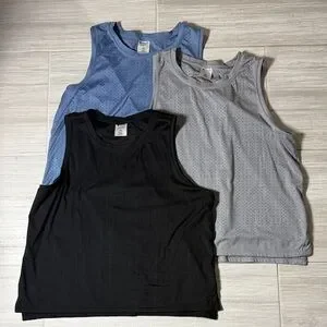 Set of three sleeveless mesh tops in black, blue, and gray. Super breathable. Perfect for casual wear or workouts. Brand is Member’s Mark. Size Large for all three. Material is 89% nylon, 11% spandex. Not fully cropped but definitely not as long as a typical top. Hardly worn.