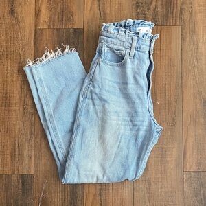 High-rise fit with a classic five-pocket design. Cropped length with raw, frayed ankle hem. Soft light wash denim for everyday wear.