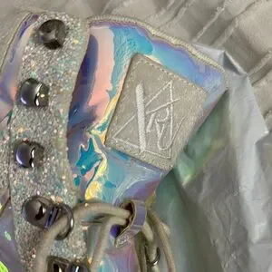 Shimmering holographic sneakers with glitter accents. Chunky platform sole. Lace-up design with metallic details.