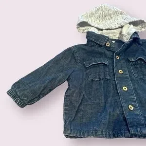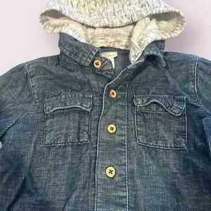 Cozy baby jacket with a soft sweatshirt style hood. Button-front closure and chest pockets for a classic look. Comfortable blue color that layers easily over everyday outfits.