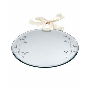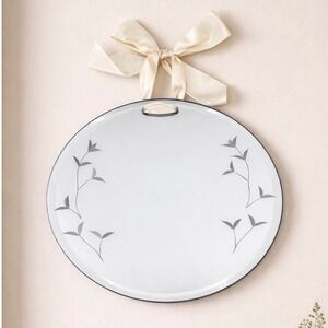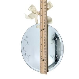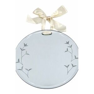Beautiful 7" round hanging mirror featuring delicate etched floral vine details and a soft satin ribbon hanger for an elegant touch. The beveled edge adds a subtle, upscale finish, making this perfect for cottage, farmhouse, or vintage-inspired décor.