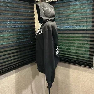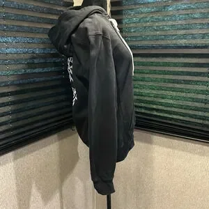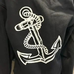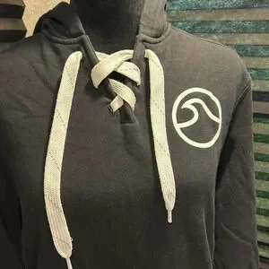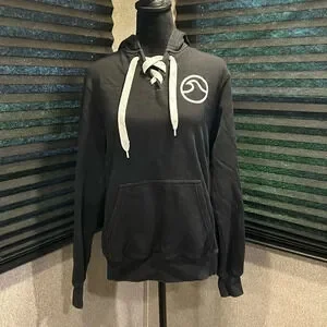 Sport Tek women’s black graphic hoodie. Lace front with salty printed on hood. Anchor & rope graphic on back and small wave graphic on chest. Cotton poly blend. Size XS Oversized