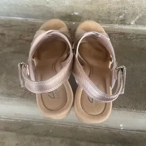 Clarks cork wedge sandals with metallic pink-tone straps. Crisscross front and open toe design. Adjustable slingback for a secure fit. Cushioned footbed for comfort. Wedge height is approx 3 inches with a 1 inch platform. Worn only a few time and in very good condition.