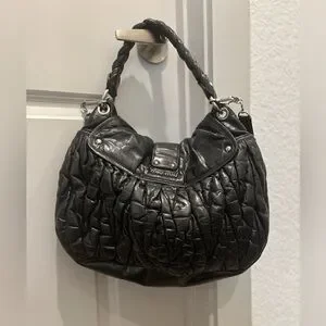 Stylish black quilted leather shoulder bag with silver-tone hardware. Features a braided top handle and adjustable shoulder strap for versatile wear. Secure flap with decorative silver clasp and subtle branded charm. Sophisticated everyday bag that pairs well with any outfit.100 % authentic
