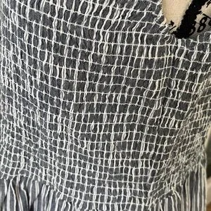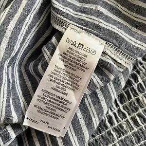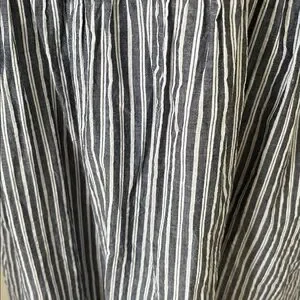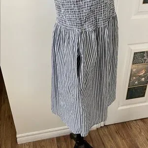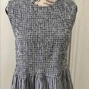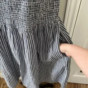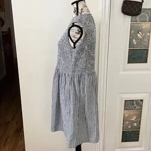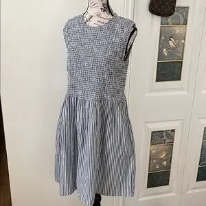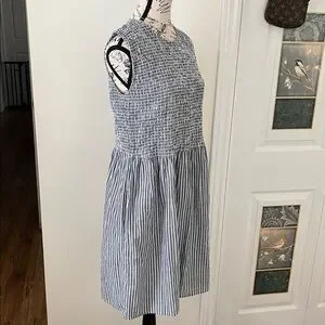 Sleeveless mini dress with textured smocked bodice. Gathered skirt with vertical blue and white stripes. Casual, breezy design great for warm days; perfect for those walks on the beach; Pool side to dinner; pit to pit 19 to 21 inches with stretch; waste 19 to 22 inches with stretch; length 36 inches; universally flattering; bodice is stretchy so would fit a small to even , depending on desired fit, possibly a 12