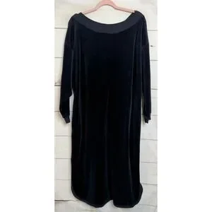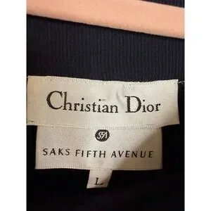 Vintage Christian Dior velour lounge dress crafted for Saks Fifth Avenue. This luxurious piece features a plush cotton-blend velour fabric in a deep navy blue or black, with an elegant boat neckline and long sleeves finished with ribbed cuffs. The left cuff is subtly detailed with an embroidered CD logo. Designed with a relaxed, oversized silhouette, it includes side slits at the hem for ease of movement. This authentic vintage garment bears the ILGWU union tag, signifying its quality American craftsmanship. Perfect for elevated lounging or as a chic house dress.